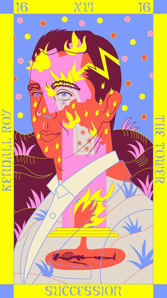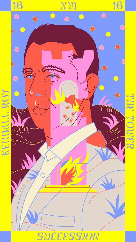 For Kendall’s portrait I chose to use symbolism from the the Tower, a Major Arcana card that evokes sudden change, upheaval, chaos, revelation, and awakening, connected to everything that he has tried to do within his father’s company and all that has happened to him in the show.